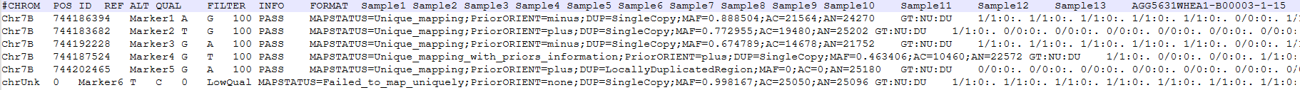 2) Several additional format flags are given e.g., MAPSTATUS=;PriorORIENT=;DUP=SingleCopy This allows the user to easily see if the Mapping was unique through provided priors or not, whether the marker mapped positively or negatively to the reference genome, and whether there were local duplicates in the reference genome
