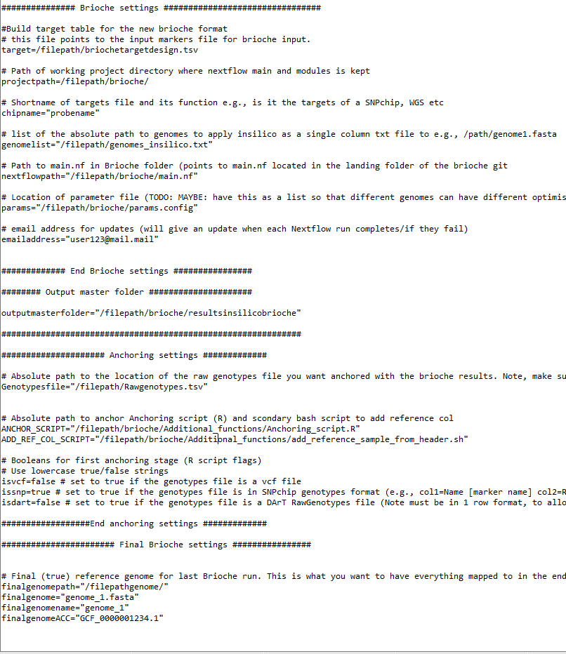 isvcforisdartorissnp).Final Brioche settings (lines 84-95, 4 settings). These settings specify the final reference genome and what final VCF the genotypes will be anchored against.