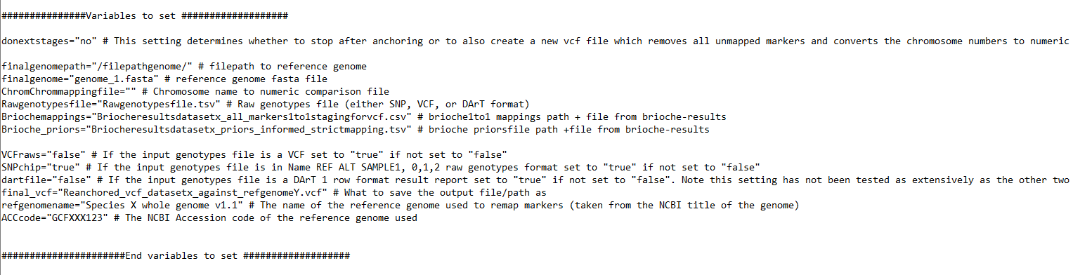 the values of variable set in the section Variables to set in the script. There are 13 variables to set but most are changing the file paths and names of input/output files to the names generated in the specific brioche run